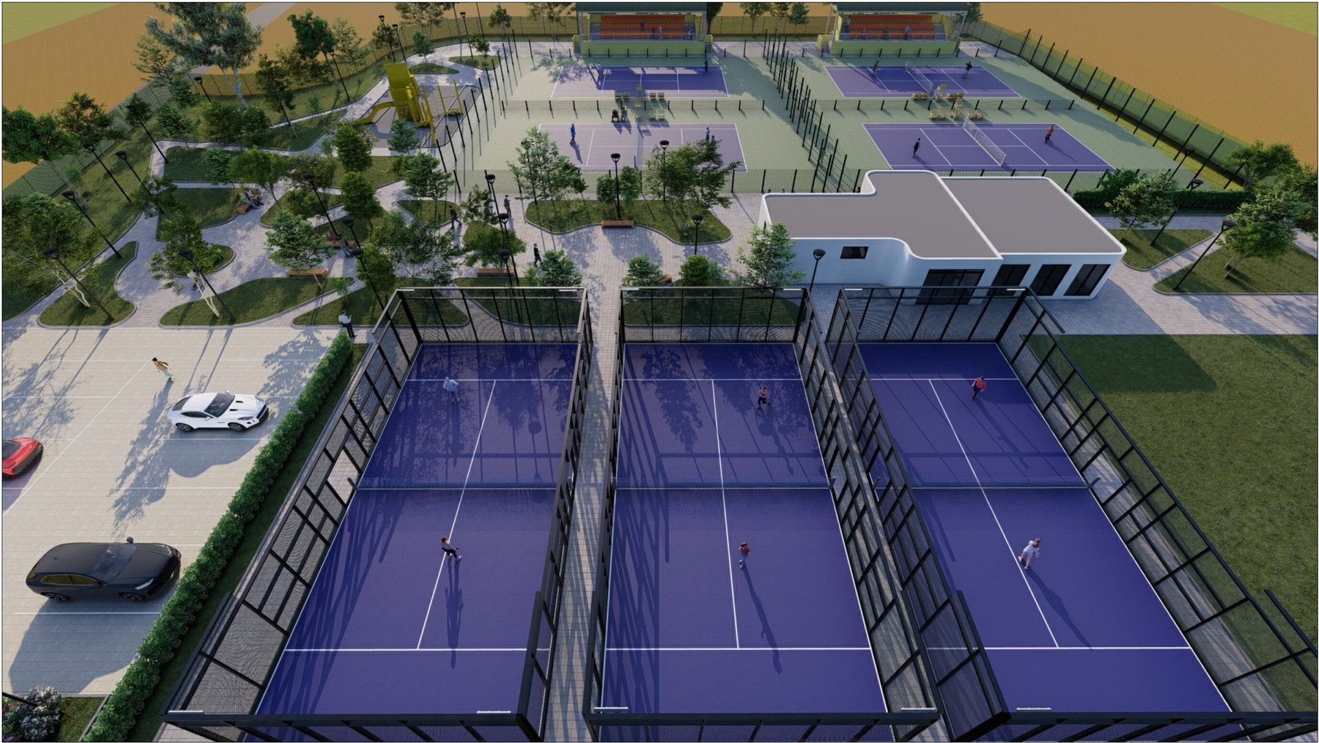 4 теннисных + 3 падел. Покрытия, освещение, трибуны.